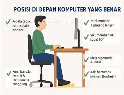 Posisikan layar monitor sejajar atau sedikit di bawah garis pandang mata. Jarak ideal antara mata dan layar adalah sekitar 40-75 cm.
